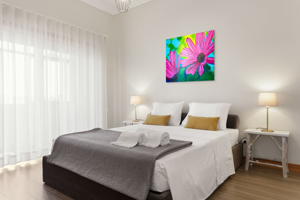 Die Blütenblätter des Lila Kapkörbchen sind nicht flach, sie haben starke Längsrillen. Licht und Schatten lassen die Blüte räumlich wirken. Ich habe meine Farben um Neonfarben-Akzente ergänzt. Die Farbe wurde in mehreren Schichten mit Spachteln und Pinsel aufgetragen.