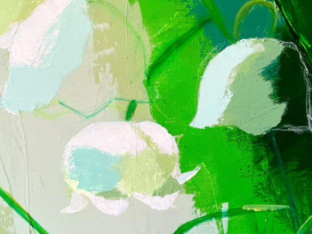 Bei dem Bild Maiglöckchen ging es mir nicht um eine realistische Darstellung. Ich habe versucht die Zartheit der kleinen Blüten eines Maiglöckchens einzufangen. Dazu habe ich zu eine semi-abstrakten Ausführung gegriffen. Es wurden nicht alle Blüten komplett ausgeführt, manchmal wurden Blütenränder nur durch Farblinien umgesetzt, wodurch die Blüten zum Teil transparent wirken. Die Farbe wurde in mehreren Schichten mit Spachteln und Pinsel aufgetragen.