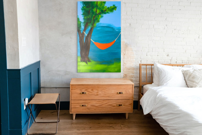 Am Ufer steht ein schattenspendender Baum, an dessen Ästen eine Hängematte mit einem Seil befestigt ist, die zum Liegen und zur Rast auffordert. Die zweite Seite der Hängematte ist für den Betrachter unsichtbar außerhalb der Szene verankert, vielleicht real an einem zweiten Baum, vielleicht imaginär in den Wolken über dem Gewässer - wohin die Träume den Hängemattennutzer an diesem Sonnentag tragen.